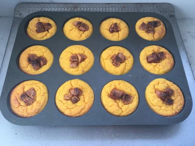 8) Portion batter into the silicon or very well greased muffin tins (or you can use cupcake liners for ease of extraction). Top with the pieces of figs.