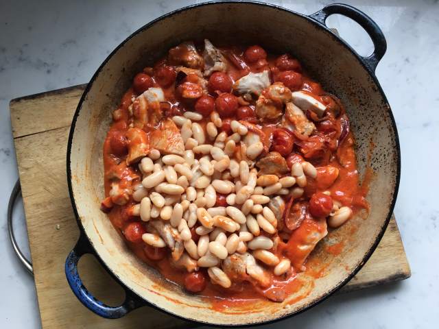 So instead I returned to a formula that has served us well when combined with fennel, leek, marinated artichokes and baby spinach, and also with sweet potato, porcini and mushrooms. These self contained one-pot chicken thigh suppers are perfect self contained saviors, that can be just as happily consumed on the couch as served for company. Their brilliance is how unflappable the chicken thigh pieces are (please don’t use breast. It will be as dry and palatable as paper by the time you come to reheat it). You can easily make this earlier in the day and then perk it up on the hob just prior to eating. For anyone who is desperate to be able to swiftly sit down to a soothing supper and something distracting on a television after they’ve finally put a child to bed/ finished work/ a work out/ what have you, they’re a boon.