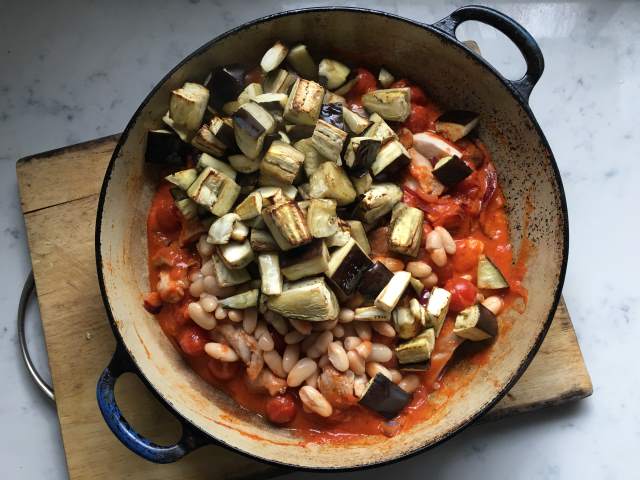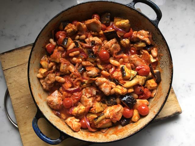 This one borrows some hard working ingredients from the deli counter for additional flavour. Marinated red peppers are an instant shot of brightness in a dish and smoked paprika is always festive. I’ve chosen to quickly roast the eggplant pieces because it cuts down on the amount of oil needed in the dish (eggplants are as thirsty as a hot pregnant lass) and leaves the hob clear for you to soften the onions and brown the chicken.