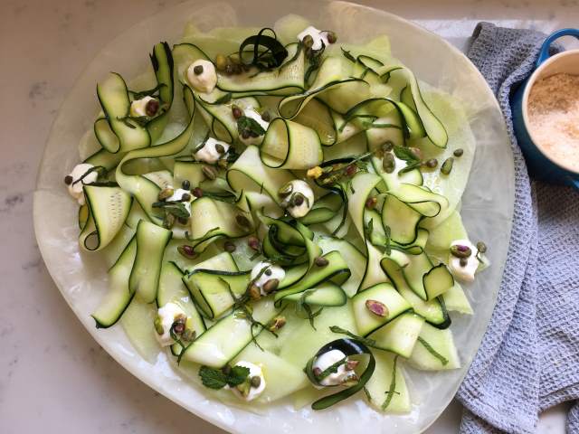 Honeydew Melon Carpaccio with Courgette, Labna and Pistachios