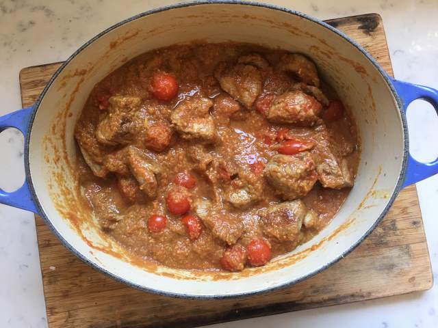 5. Return the lamb to the pan. Add the tomatoes and stir to combine. Clamp the lid on and place in the oven for 2 hours, or simmer with the lid on, on a very low heat for 2 hours.