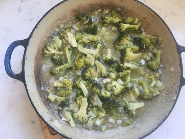 7) After 30 minutes remove the lid and stir the broccoli. The broccoli should soften under the point of a knife.