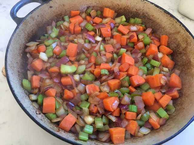 2 Add the remaining olive oil to the bottom of the pan and sautee the onions, carrot and celery for 7 minutes, until the onion has softened.