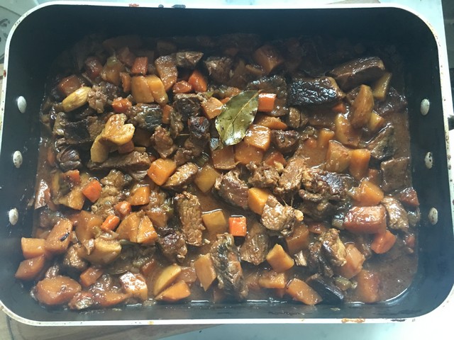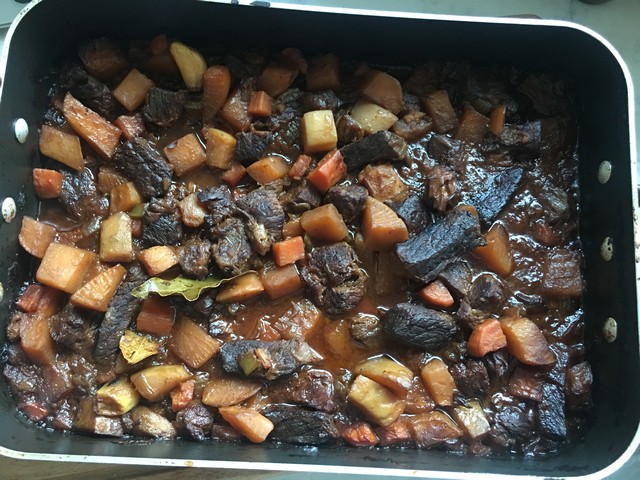 3 Add the and to the bottom of the pan to deglaze and bring to a boil, stirring to rescue any flavour that’s clinging to the bottom of the pan. Transfer everything to a large roasting dish and add the tomato paste, bay leaves, then the whole peeled garlic cloves, pieces of swede and enough water or stock to come 4/5 of the way up the side of the meat and vegetables. You don’t want them to be completely covered. Cover with foil and place in the oven for 4 hours.
